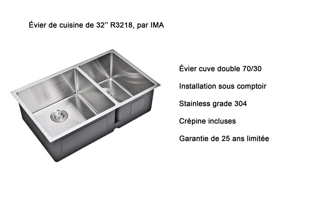 En ce qui concerne les éviers de cuisine, deux types d'installation, montage par le dessus ou à montage sous comptoir, plusieurs modèles sont offerts en acier inoxydable et dans des matériaux tels que l'argile réfractaire et la fonte émaillée.